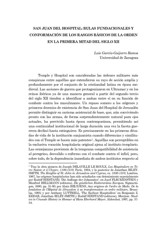 San Juan del Hospital: bulas fundacionales y conformación de los rasgos básico de la orden en la primera mitad del siglo XII
